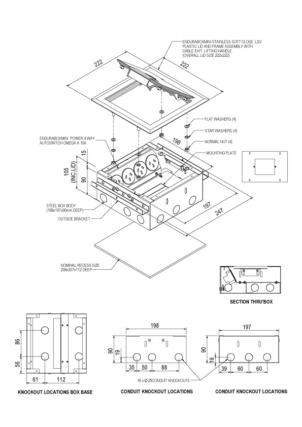 EBM BOX, STAINLESS STEEL HEAVY DUTY FLUSH SOFT CLOSE LID BEVEL SURROUND, 4 X AUTO SWITCHED POWER, 1 X PROVISION TO MOUNT STANDARD PLATE