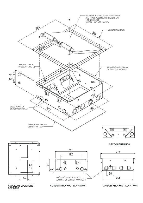 EB98 BOX, STAINLESS STEEL FLUSH SOFT CLOSE LID BEVEL SURROUND, 4 X PROVISION TO MOUNT STANDARD PLATE