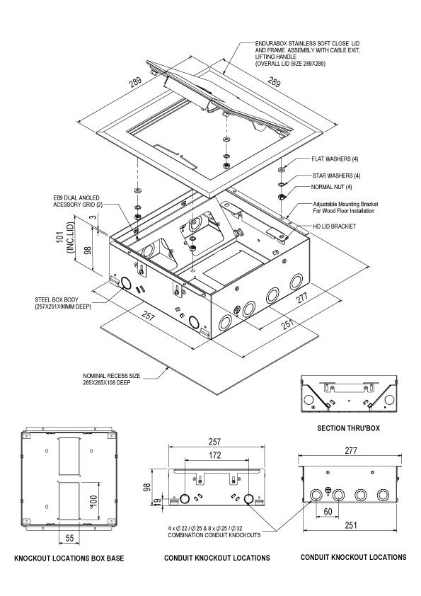 EB98 BOX, STAINLESS STEEL HEAVY DUTY FLUSH SOFT CLOSE LID BEVEL SURROUND, 4 X PROVISION TO MOUNT STANDARD PLATE