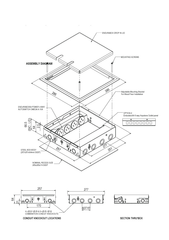 EB64 BOX, DROP IN LID, SURROUND, 4 X AUTO SWITCHED POWER, PROVISION TO MOUNT 8 X KEYSTONE DATA (EXCLUDES BEZEL)