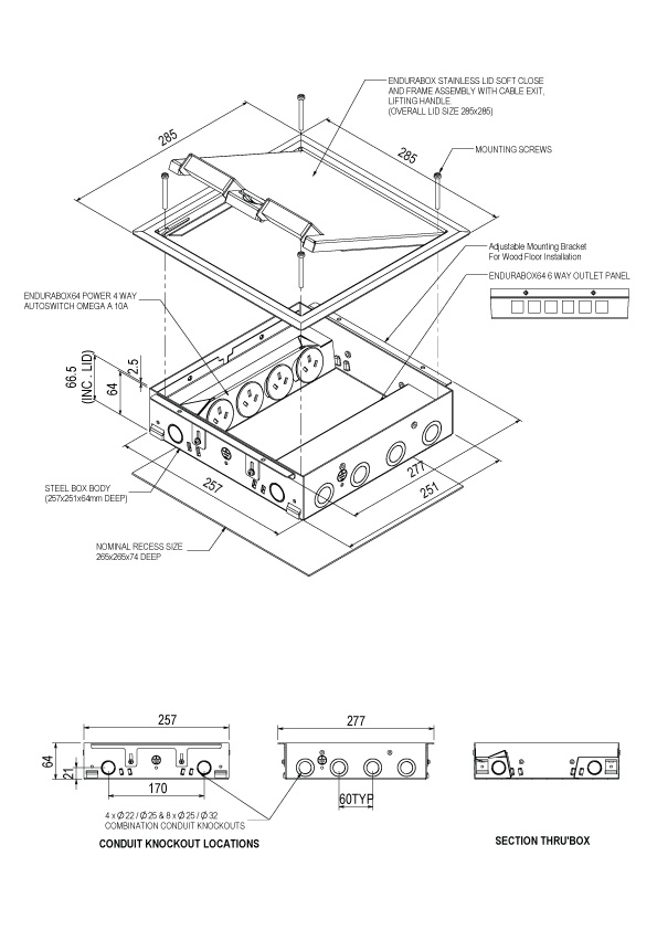 The EB6SFB4P6D Endura Series Floor Box from Cableaway is a high-capacity in-floor solution designed for commercial and office environments. Featuring a durable flush lid and robust steel body, it delivers a clean, low-profile finish while withstanding high-traffic areas. Configured with 4 power outlets and 6 data provisions, it supports modern workspace connectivity requirements. The unit allows flexible integration of power, data, and AV services, making it ideal for meeting rooms and open-plan layouts. Suitable for new installations and retrofit projects, it includes multiple conduit entry points for efficient cable routing and reliable service access.