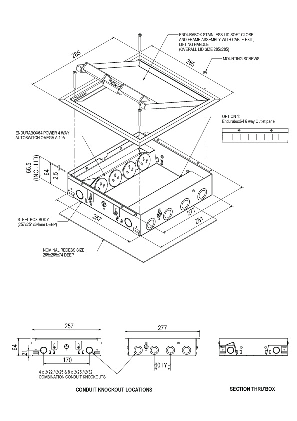 The EB6SRBP6D Endura Series Floor Box from Cableaway is a versatile in-floor solution designed for commercial and office environments. Featuring a recessed lid, it allows floor coverings such as carpet or tile to be integrated for a seamless, low-profile finish. Built with a durable steel body, it is designed to withstand high-traffic areas while maintaining performance and reliability. Configured with 4 power outlets and 6 data provisions, it supports modern connectivity requirements. Suitable for new installations and retrofit projects, it includes multiple conduit entry points for efficient cable routing and flexible service integration.